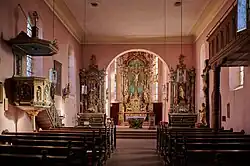 Die Chorwände zieren ein Flachrelief mit der Darstellung der heiligen Dorothea aus dem Ende des 15. Jahrhunderts sowie eine Figur des auferstandenen Christus aus dem 20. Jahrhundert. Die Chorfenster zeigen Darstellungen der Herzen Jesu und Mariens, ergänzt durch eine Ornamentmalerei aus dem Jahr 1892. Die Chordecke schmücken Stuckleisten mit dem IHS-Monogramm.