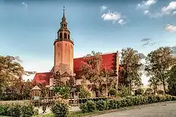Der dreischiffige Backsteinbau steht auf einem kreuzförmigen Grundriss und entstand im Stil der Neorenaissance. Die geostete Kirche besitzt einen dreiseitig geschlossenen Chor und einen Glockenturm mit Laterne an der Nordseite. Das Querschiff ist mit einem Satteldach versehen. An der Westseite besitzt der Bau zwei Giebel, teilweise versehen mit Stufengiebeln.
