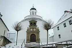 Die Rotunde wurde um 1625 im Auftrag von Maria Elisabeth von Oettingen-Spielberg als Votivkapelle in Anlehnung an die Wallfahrtskapelle auf dem Lechfeld errichtet. Der kreisförmige Zentralbau ist mit einer Kuppel bedeckt, die von einer achtseitigen Laterne gekrönt ist. Das nördliche rustizierte Portale ist weitgehend erhalten. Das südliche Portal wurde um 1625 mit einer Ädikula gerahmt. Im Tympanon befindet sich ein Marienbildnis. Darüber ist ein offener Glockenstuhl mit zwei Kirchenglocken angebracht.