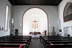 Die Saalkirche wurde 1891 erbaut. Der Kirchturm erhielt 1928–1930 einen Aufsatz in expressionistischen Formen. Ein Kirchenschiff aus Bruchsteinen wurde ihm seitlich angefügt. Nach den Beschädigungen im Zweiten Weltkrieg wurde die Kirche vereinfacht wieder aufgebaut. Die Orgel mit zwölf Registern, zwei Manualen und Pedal wurde 1950 von Eduard Wagenbach gebaut.
