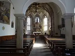 Das Kirchenschiff verfügte zunächst über eine Flachdecke, von der noch Spuren von Fresken oberhalb des gegenwärtigen Gewölbes zeugen. Das Tonnengewölbe entstand möglicherweise 1612 unter der Amtszeit des Pfarrers Ulrich von Kurz zum Thurm. Die breiten Fenster im Chor sind in gotische Maßwerkform gegliedert und mit bemalten Glasfenster aus der Zeit um 1520 versehen.[4] Letztere stehen möglicherweise in Zusammenhang mit dem Pfarrer und Domherr Veit von Niederthor und werden der Augsburger Schule zugeschrieben. Auf den Schlusssteinen des gotischen Netzrippengewölbes sind u. a. die Wappen der Adelsgeschlechter von Payrsberg, von Boymont, von Andrian-Werburg, von Hälen zu Mayenburg und von Botsch von Zwingenburg angebracht.