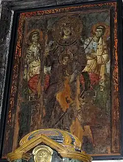 Diese Tendenz zur Politisierung des Marienbildes fand einen Höhepunkt im Bild Mariens als Kaiserin in einer byzantinischen Kapelle im Amphitheater von Durres (Albanien, vor 630).[18]