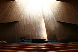 Der Architekt Justus Dahinden beschreibt den Innenraum mit folgenden Worten: «Wie Kulissen schieben sich die schrägen Decken und Wände in- und gegeneinander, lassen zum Altar hin den Raum an Höhe gewinnen und reflektieren das Licht auf vielfältige Weise, das von dem – den Blicken verborgenen – Fenster über der Mensa die Altarzonen aufhellt. Das rohe Holz gibt dem Raum Wärme und eine gewisse an einen Wohnraum erinnernde Behaglichkeit.»[18]