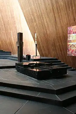 Malin schreibt zur Chorgestaltung: „Ganz augenfällig steht der Altar in der ideellen Mitte des Raumes. Die Architektur versammelt hier alle Mittel, um die Aussage zu unterstreichen: der Raum ist hier geweitet, das Licht fällt auf den Altar hin, die Linien, welche die Nahtstellen der verschiedenen Holzflächen zeichnen, verweisen auf den Altar.“[22]