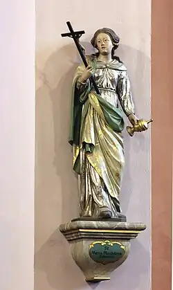 Der Gedenktag der hl. Maria Magdalena ist der 22. Juli (römisch-katholisch, orthodox, anglikanisch, evangelisch, altkatholisch). Für die römisch-katholische Kirche wurde der Gedenktag mit einem Dekret vom 3. Juni 2016 in den Rang eines Festes im Calendarium Romanum Generale erhoben.[37][38] In der Kirchengeschichte kam dem Fest bei Kanonikerorden in längster Zeit bereits dieser Stellenwert zu.[39] Die Heilige ist Schutzpatronin der Frauen, der Verführten, der reuigen Sünderinnen, der Schüler, Studenten und Gefangenen sowie der Winzer, Weinhändler, Handschuhmacher, Friseure und Parfümeure.[40] Maria Magdalena ist die Patronin der im 13. Jahrhundert gegründeten Ordensgemeinschaft der Magdalenerinnen. Außerdem ist sie die Patronin der spanischen Stadt Viana und der italienischen Stadt Cavareno. Sie wird gegen Gewitter, Ungeziefer und Augenleiden angerufen.