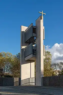 Der 25 Meter hohe markante Glockenturm aus rechtwinklig zueinander gestellten Sichtbetonplatten bildet einen der beiden Eingänge, die das Eingangstor und den zweigeschossigen Glockenstuhl mit fünf Glocken zwischen sich nehmen. Eine ursprünglich geplante 48 Meter hohe Turmnadel konnte aus Gründen der Flugsicherung für den Flughafen Tegel nicht gebaut werden. An der Außenseite der Mauer weisen zwei Schrifttafeln mit Texten von Papst Pius XII. und Julius Kardinal Döpfner auf die Bedeutung des Bauwerks hin.[12]