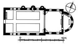 Das Langhaus der Kirche besteht aus einem Saal mit vier Fensterachsen und flachem Tonnengewölbe. Gegliedert ist das Langhaus durch ein kräftiges umlaufendes Gebälk. Dieses ruht im Langhaus auf Pilastern und im Chor auf Kapitellkonsolen. Eine Doppelempore befindet sich an der Westseite des Langhauses. An das Langhaus schließt sich der nahezu quadratische Chor an. Dieser ist im weiteren Verlauf in Richtung Osten halbrund geschlossen. Der halbrunde Chor ist zweigeschossig. Im Obergeschoss befindet sich der obere Hochaltar. Das Untergeschoss enthält die Sakristei mit einer Flachdecke. Der Treppenaufgang zum Obergeschoss befindet sich an der Nordseite der Sakristei. Die Sakristei ist mit zwei stichbogigen Türen rechts und links des Altars mit dem Chor verbunden. Die beiden Türen sind mit Voluten und Gebälkstücken bekrönt. Die südliche der beiden Türen könnte noch aus dem Vorgängerbau stammen. Im Chor ist eine Flachkuppel vorhanden. Das Langhaus und der quadratische Chor sind mit einem Satteldach, der halbrunde Chorschluss ist mit einem Mansarddach gedeckt. Die westliche Fassade ist durch Pilaster gegliedert. Der restliche Außenfassade besitzt aufgemalte Pilaster. Der Giebel der Westseite ist mehrfach geschwungen mit aufgesetzten Kugeln. Bekrönt wird der Giebel durch ein kleines, aus zwei Geschossen bestehendes Türmchen mit Ecklisenen. Das Türmchen ist mit einer, im unteren Bereich gebauchten, Haube mit geschweifter Spitze gedeckt.