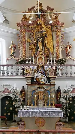 Der Hochaltar der Kirche befindet sich im Obergeschoss des Chores über der Sakristei. Er besteht aus einem marmorierten Holzaufbau mit vergoldetem Rocailledekor. Geschaffen wurde der Hochaltar 1760/1770. Im Zentrum des Hochaltares befindet sich das Gnadenbild, eine Muttergottesfigur aus der Zeit um 1520. Die Figur ist umgeben von zwei Engeln neben einer Vorhangdraperie. Einer der Engel trägt Krönungsinsignien. Im geschweiften Auszug befindet sich eine Figur Gottvaters, rechts und links auf Voluten Engel. Die Mensa des Hochaltares ist geschwungen. Darüber befindet sich ein Drehnischentabernakel. Zwei Leuchter tragende Engel sind auf dem Bekrönungsgebälk des Tabernakels zu finden. Rechts und links des Hochaltars befinden sich zwei geschwungene Durchgänge. Auf diesen befinden sich gefasste Holzfiguren der Hl. Gordian und Epimachus. Die Figuren des Hochaltares, mit Ausnahme des Gnadenbildes, werden Konrad Hegenauer zugeschrieben.