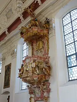 Die Kanzel stammt aus der Mitte des 18. Jahrhunderts und ist wie die Altäre ein marmorierter Holzaufbau. Verziert ist die Kanzel mit vergoldetem Muschelwerkdekor. Der Korb der Kanzel ist dreiseitig gegliedert. Auf den unterteilenden Voluten befinden sich Figuren der vier Kirchenväter. An den Ecken des Schalldeckels sind Figuren der vier Evangelisten. Bekrönt wird die Kanzel von einem Posaunenengel.
