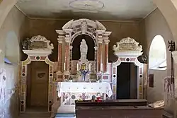 Der Innenraum ist geteilt durch einen Rundbogen, der das Presbyterium, in dem sich ein kleiner Altar befindet, von dem Langhaus abgrenzt. Der Boden ist mit rechteckigen Platten aus Kalkstein ausgelegt. Hinter der Kirche befinden sich die Gräber des Friedhofes, der von einer hohen Mauer aus Kalkstein umsäumt wird.