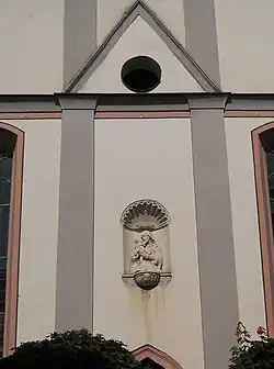 Über dem Portal befindet sich eine Madonnen-Halbfigur aus Jurakalk, die dem Eichstätter Barock-Bildhauer Christian Handschuher zugeschrieben wird und sich in der Gestaltung an das Gnadenbild des Hauptaltars anlehnt. Das darunter eingemauerte Brunnenbecken, eine Muschelschale, stammt vermutlich vom ursprünglichen Gnadenbrunnen am Turm. Die Madonna am rechten Treppenaufgang hinter einer vergitterten Mauernische ist eine gotische Steinfigur (14. Jahrhundert).