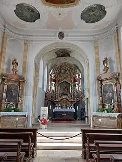 Der Stuck im Chor und an der geschweiften Orgelemporenbrüstung wurde 1942/43 rekonstruiert. 1942 wurde auch der heutige, „reiche, aufgebrochen-bewegte Rokokoaltar um 1760“[2] aus der abgebrochenen Pfarrkirche von Mühlhausen bei Neustadt an der Donau hierher gebracht. Die Seitenaltäre aus der Zeit um 1656 wurden 1744 neu gefasst und mit neuen Altarbildern versehen, die am rechten Altar den hl. Antonius von Padua und am linken eine Heilige Familie zeigen. Zwischenzeitlich durch Figuren ersetzt, wurden die Tafelbilder nach Restaurierungsmaßnahmen 1994 zurückgeführt.[2] Der „überdurchschnittlich qualitätvolle Kreuzweg“[3] stammt von 1779. Die geschnitzten Wangen des Laiengestühls stammen noch aus der Barockzeit (um 1710/20). Eine Ölberggruppe (ohne Apostel) an der rechten Langhauswand besteht aus Christus als einer „guten Rokokofigur“[9] und einer älteren Engelsfigur mit dem Kelch. Die Orgel baute 1887 Joseph Bittner.[4]