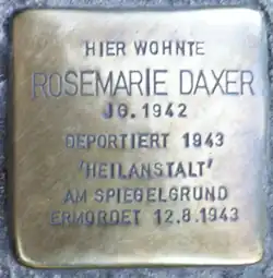 In Salzburg ist in der Griesgasse 8 ein Stolperstein angebracht, mit dem an Rosemarie Daxer erinnert wird. Sie wurde am 1. Februar 1942 als uneheliches Kind einer Hausangestellten geboren und im Alter von zwei Wochen im Marianum untergebracht. Auf Antrag des Salzburger Reichsstatthalters Gustav Adolf Scheel wurde sie in die Anstalt Am Spiegelgrund eingewiesen. Nach der Aufnahmeuntersuchungen durch Ernst Illing wurde sie am 10. August 1943 von Marianne Türk an den Reichsausschuss zur wissenschaftlichen Erfassung von erb- und anlagebedingten schweren Leiden gemeldet und war zwei Tage später tot (offizielle Todesursache „Lungenentzündung“).[8]