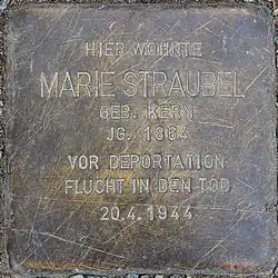 Zum Gedenken an Marie Straubel liegt vor ihrem Wohnhaus in Jena, Botzstraße 10 seit 2010 ein Stolperstein.[1][2][3]