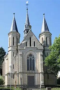 Die freistehende Kapelle, in ihrem Mittelpunkt 14,40 Meter breit und 21,10 Meter lang, bildet ein gleichseitiges Sechseck mit Sterngewölbe, das von trapezförmigen Radialkapellen umsäumt wird. An der Portalseite befindet sich eine kleine Vorhalle mit darüberliegender Orgelbühne, die von zwei Türmen flankiert wird. Dreiteilige Maßwerkfenster werden durch hoch aufragende Strebepfeiler von den Turmflanken getrennt. Auf dem zentralen Pyramidendach sitzt ein Dachreiter, der mit seiner Höhe von 31 m schon von weitem den Blick auf sich zieht. Die niedrigeren, bis auf die mit einem Giebel versehene Portalseite abgewalmten Satteldächer der einzelnen Raumteile schließen sich dem Dach des Kernbaus an. Die Kreuzblume über dem Giebel, die Maßwerkfenster, Kapitelle und die Schlusssteine wurden von dem Düsseldorfer Steinmetzmeister Theodor Haake ausgeführt.