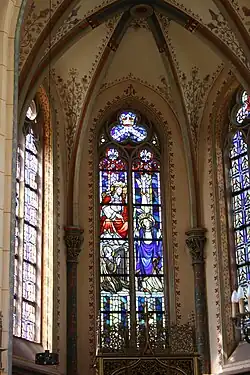Die helle und gleichmäßige Belichtung der Kapelle wird durch die Maßwerkfenster über dem Sockelgeschoss erzielt, ermöglicht durch das Stelzen der Gewölbekappen und die schlanken Dienste. Die ursprünglichen Bleiglasfenster, von der Königlich Sächsischen Hof-Glasmalerwerkstatt Hertel & Lersch in Düsseldorf hergestellt, wurden durch Fliegerbomben in der Neujahrsnacht 1945 zerstört. Das Chorfenster mit der Darstellung der Marienkrönung wurde 1951 von der Glasmalerei Heinrich Maier in Bad Neuenahr angefertigt. Die Fußbodenfliesen, ebenfalls von Pickel entworfen, lieferte die Sinziger Mosaikplatten- & Thonwaaren-Fabrik. Nach Entwürfen von Pickel wurde der Altar aus Bamberger Sandstein und die 12 Weihekreuze gefertigt.