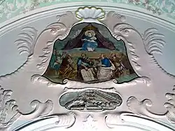 Von den sechs Fresken in der Marienkapelle stammen die fünf Deckenfresken von Johann Baptist Zimmermann, das Fresko an der Südwand von einem unbekannten Maler. Sie illustrieren Anrufungen aus der Lauretanischen Litanei und sind nach den Kupferstichen des Buches Elogia Mariana Ex Lytaniis Lauretanis Deprompta von Isaac Oxoviensis aus dem Jahre 1700 gestaltet.[4] Im Zentrum des Deckengewölbes der Marienkapelle befindet sich ein großes rundes Fresko, das von vier kleinen ovalen Fresken umgeben ist. Sie sind durch eingedrungene Feuchtigkeit beschädigt, bei drei kleinen Fresken sind nur noch spärliche Reste erkennbar. Da sich Zimmermann sehr stark an der Buchvorlage orientiert hat, kann man dennoch die abgebildeten Motive bei allen Fresken zweifelsfrei feststellen.