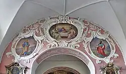 Die Kanzel (um 1760) trägt an der Brüstung sitzende Propheten in Weißpolimentfassung, der Schalldeckel trägt den Franziskanerheiligen Johannes Capistran und Personifikationen der drei Tugenden, Glaube, Hoffnung und Liebe. Das Orgelgehäuse stammt von 1767 von Ferdinand Schwarz.