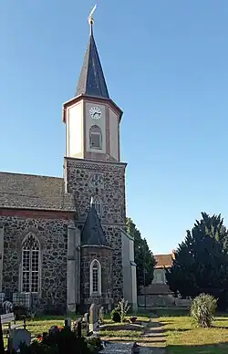 Der umgebende Friedhof hat eine schmiedeeiserne Einfriedung zur Dorfstraße, ein Gefallenendenkmal, ein Marmorrelief in der Friedhofsmauer und Marmorrelief der Familie Achilles.
