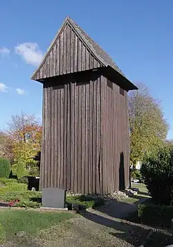 Zur Kirche gehört ein freistehender hölzerner Glockenturm, ein sogenannter Glockenstapel. Er erhielt seine heutige Form mit dem in Angeln ungewöhnlichen Satteldachabschluss 1765 unter Benutzung des tragenden Gerüstes eines Vorgängers des 16. Jahrhunderts. Nach 1882 sind die beiden größeren Glocken (von 1623 bzw. 1767) verschwunden, seitdem besteht das Geläut aus zwei Gussstahlglocken des Bochumer Verein. Eine kleinere Messglocke musste im Verlauf des Zweiten Weltkrieges abgegeben werden. Auch der Glockenturm ist denkmalgeschützt.[1]
