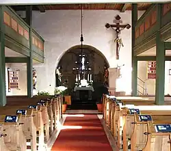 Das Kirchengebäude ist ein Saalbau mit Satteldach und Ausstattung. Die Chorturmanlage besteht aus Sandsteinquadern, der Rechteckturm hat ein Zeltdach. Im Kern stammt sie aus dem 13. Jahrhundert und wurde 1847 verändert. Die Kirche ist der Mutter Jesu Maria gewidmet und ein geschütztes Baudenkmal.[1][2]
