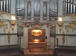 Die Orgel wurde 1739 von Caspar König aus Ingolstadt erbaut und 1878 von Max Maerz unter Beibehaltung des Prospekts umgebaut. 1959 wurde das Instrument durch Orgelbau Nenninger umfassend restauriert, wobei auch die Spiel- und Registertrakturen neu gebaut und der Tonumfang erweitert wurde. Im Zuge einer Restaurierung durch Gerhard Schmid in den Jahren 1984–1987 erhielt die Orgel ein zusätzliches Schwellwerk, einen neuen viermanualigen Spieltisch und weitere Register. Das erste Manual wurde als freies Koppelmanual ausgestaltet. Somit hat das Instrument heute 39 Register auf vier Manualen und Pedal. Die Koppeln sind als Tritte vorhanden: II/P, III/P, IV/P; II/I, III/I, IV/I; die Orgel ist komplett mechanisch (Register und Traktur), andere Spielhilfen gibt es nicht.[6]