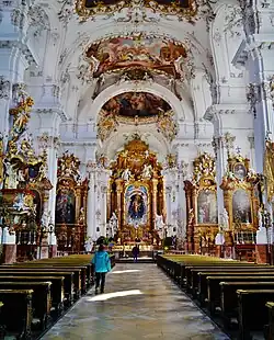 Der Blick des von Westen Eintretenden wird unwillkürlich zum Hochaltar gelenkt. Die Seitenaltäre an den Wandpfeilern und der kräftige Chorbogen mit seinem stuckierten Vorhang vermitteln den Eindruck einer barocken Theaterkulisse, die von zahlreichen Putten, Engeln und Heiligen belebt wird. Auf der Bühne dieses Theatrum sacrum steht der Hochaltar im Mittelpunkt.