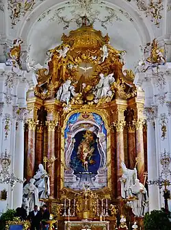 Der Hochaltar des Münchener Hofbildhauers Joachim Dietrich († 4. Juni 1753) füllt die gesamte Apsis. Am Entwurf soll auch François de Cuvilliés mitgewirkt haben. Flankierende Rund- und Halbsäulen tragen das verkröpfte Gebälk, über dem sich der von Voluten gestützte und von einem Baldachin überwölbte Altarauszug erhebt. Das Altarblatt zeigt die Aufnahme Marias in den Himmel und stammt von Balthasar Augustin Albrecht. Es kann in einen Schacht versenkt werden. Damit wird die Raumnische einer Mysterienbühne sichtbar, die im Laufe des Kirchenjahres unterschiedliche Szenen der Heilsgeschichte präsentieren kann. Eine davon, das Heilige Grab (um 1736), stammt von Johann Georg Bergmüller, dem Maler der Deckenfresken.[5]