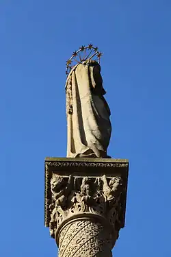 Über einem quadratischen Sockel, in dessen bogenförmig gerahmten Nischen Statuen der Propheten Jeremia, Daniel, Jesaja und Ezechiel stehen, erhebt sich eine runde Säule, die auf halber Höhe mit folgender lateinischer Inschrift versehen ist: „Sancta Maria sine labe concepta, ora pro nobis“ (Heilige Maria, ohne Erbschuld empfangen, bitte für uns). Die Inschrift gliedert den Säulenschaft in zwei Abschnitte, die jeweils durch ein Arabeskenmuster verziert sind. Auf dem Kapitell, das mit Mensch, Adler, Stier und Löwe als Hinweis auf die vier Evangelisten sowie mit Akanthusblättern und Engelsbüsten plastisch ausgebildet ist, steht eine Statue der Maria Immaculata.[4] Zu Füßen der stehenden Madonna ist eine Mondsichel zu sehen. Das Haupt der Maria wird von einer Sternengloriole betont. Die Hände hat sie zum Zeichen ihrer Barmherzigkeit über ihrer Brust zusammengelegt.