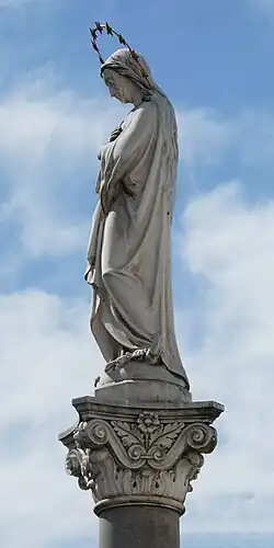 Auf einem hohen Postament aus Granit steht die korinthische Säule mit der Marienfigur. Die Maria mit vor der Brust gekreuzten Armen steht auf der Mondsichel und ihr Haupt wird von einem Sternenkranz umgeben, entsprechend der Offenbarung des Johannes (Offb, 12,1–5 ).