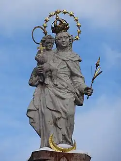 Die barocke Madonnenfigur steht auf einer hohen Sandsteinsäule. Maria trägt das Jesuskind, das in der rechten Hand eine Weltkugel mit Kreuz hält, auf dem rechten Arm; in der linken Hand hält sie ein Lilienszepter.