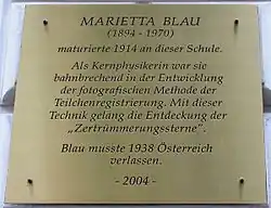 - ↑ Gedenktafel für die Kernphysikerin Marietta Blau. In Rathauskorrespondenz vom 8. November 2004.