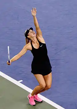 Zu Beginn ihrer Karriere galten Scharapowas Aufschläge als besonders kraftvoll und gefährlich und zählten zu den besten auf der WTA Tour.[20][25] Seit Anfang 2007 wurde ihr Aufschlag weniger effektiv, da sie wegen ihrer Schulterverletzung mehr Fehler beim ersten Aufschlag und somit auch mehr Doppelfehler produzierte.[25][26] Als Reaktion darauf veränderte Scharapowa ihre Aufschlagtechnik hin zu einem kürzeren Schwung.[27] Da dies ohne den erhofften Erfolg blieb, kehrte sie nach den US Open 2009 zu ihrer ursprünglichen Technik zurück und servierte ab dann noch kraftvoller. Ihre höchste Aufschlaggeschwindigkeit war 195 km/h.[28]