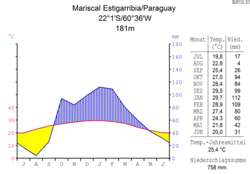 - ↑ Mariscal Estigarribia. Paraguay (Südamerika). In: frendy.de. Archiviert vom (nicht mehr online verfügbar) am 20. Dezember 2016; abgerufen am 16. Juli 2017 (mit Klimatabelle).