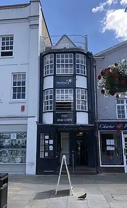 Das dreigeschossige Gebäude entstand etwa in der ersten Hälfte des 18. Jahrhunderts. Die Giebelseiten nach Norden und Süden sind sehr schmal. Vor den oberen Stockwerken befindet sich auf beiden Seiten jeweils ein erkerartiger Vorbau. Auf der Nordseite ist dem Erker ein Balkon aufgesetzt. Im frühen 19. Jahrhundert erhielt das Erdgeschoss des Hauses Ladenfronten, die später modernisiert wurden. Derzeit (Stand 2019) ist im Gebäude ein Fish-and-Chips-Imbiss untergebracht, der von beiden Straßenseiten aus betretbar ist.