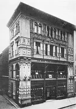 Das Gebäude war als Wohn- und Geschäftshaus „Zu den Vier Jahreszeiten“ bekannt. Es war ein viergeschossiges Gebäude, wobei die unteren beiden Geschosse als Doppelgeschoss mit großen Schaufenstern eingerichtet wurden. Die beiden unteren Geschosse wurden von den oberen Geschossen durch ein Gesims mit dem Schriftzug ZU DEN VIER JAHRESZEITEN abgetrennt. Darüber erhoben sich die beiden Obergeschosse, die nach oben mit einem „außerordentlich kräftigen“[1] Kranzgesims abschlossen. Das dominante Kranzgesims gab dem Haus die „kubische Blockhaftigkeit“[1] im Stile der italienischen Renaissance. Motive der französischen Renaissance an dem Hause waren die Drillingsfenster, die „mittelrisalitartig“ zusammengefasst waren und die kannelierten Pilaster in Kolossalordnung. Niederländische bzw. deutsche Renaissance war das üppige Beschlagwerk im Florisstil, das die Brüstungsfelder der Fenster schmückte.