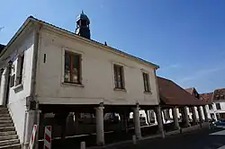 Die Dachkonstruktion wird von mächtigen Säulen getragen. Im Maison commune an der Schmalseite wurde bis in die 1940er Jahre vom Friedensrichter bei kleineren Rechtsstreitigkeiten Recht gesprochen. Auf dem Gebäude sitzt ein Dachreiter mit einer Uhr.