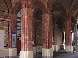Je drei 7,6 Meter breite Seitenschiffe begleiteten links und rechts das Mittelschiff. 6 Meter hohe Gusseisensäulen und 1,84 Meter lange Zungenmauern an den Außenmauern trugen die für die Beleuchtung und Belüftung günstigen Sheddächer. Die Außenwände im Innern der Markthalle gestaltete Blankenstein wiederum mit den bereits von den Durchfahrten bekannten hellgelben und hellroten Klinkern und glasierten Ziegeln. Über einem 31 Zentimeter hohen Granitsockel folgten im unteren Viertel der Wand hellrote Verblendersteine. Die oberen, hellgelb verblendeten Wandflächen trennte ein mit hellroten Formsteinen ausgeführtes Gesims. Das Mittelschiff mit der Durchfahrt war mit sechs Zentimeter starken Eisenklinkern gepflastert, die Gänge und Inseln mit den Marktständen mit rutschfesten, gerippten Sinzinger Fliesen.[2]