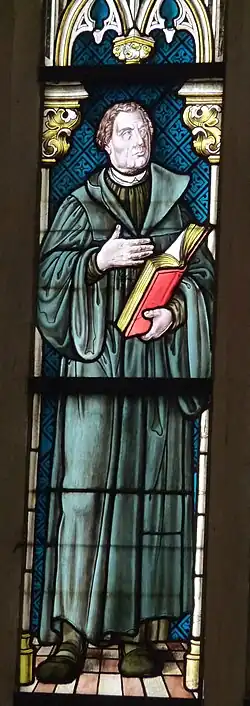 Die zwei- und dreiteiligen Maßwerkfenster im Chor besitzen eine Bleiverglasung, die zwischen 1894 und 1901 von der Glasmalerei K. J. Schultz in Marburg ausgeführt wurde.[2] Die beiden mittleren Fenster stellen die Kreuzigung und Auferstehung Christi dar. Auf dem linken Chorfenster wird Jesus dargestellt, der die Kinder segnet. Das rechte Fenster hat die Taufe der heiligen Lydia durch den Apostel Paulus zum Thema. Das sogenannte Reformatorenfenster ist Martin Luther und Philipp Melanchthon gewidmet, in deren Mitte der hessische Landgraf Philipp I. vertreten ist.