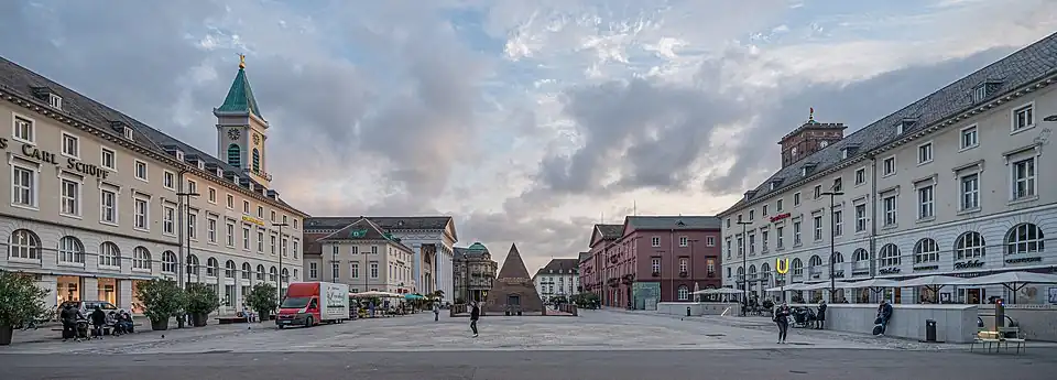 ![]() Der Karlsruher Marktplatz mit Pyramide und Rathaus | |