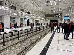 Der U-Bahnhof Marktplatz ist ein zentraler Knotenpunkt der Stadt- und Straßenbahn Karlsruhe mit fünf Gleisen. Der unterirdische Bahnhof wurde im Rahmen der Kombilösung zwischen 2012 und 2021 erbaut und im Dezember 2021 zusammen mit dem Stadtbahntunnel eröffnet. Er ersetzte die bisherige oberirdische Straßenbahn-Haltestelle.[2] Auf den beiden Teil-Stationen Kaiserstraße (Gleis 1–2) und Pyramide (Gleis 3–5) halten zwei Straßenbahnlinien und alle Stadtbahnlinien.