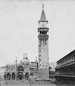 - ↑ Es gibt viele unterschiedliche, minutengenaue Angaben. Am verlässlichsten ist wohl der Bericht, der am nächsten Tag in der Gazzetta di Venezia erschien. Der Reporter schrieb u. a.: „… Uhrturm, der eben halbzehn Uhr geschlagen hatte. Mit zitterndem Herzen beobachtete ich das stolze gewaltige Bauwerk […] ich habe eine Uhr bei mir – 9.47, sieben oder acht Minuten sind vergangen, rund um den Campanile ist alles leer […] seine Fassade hin zur Basilika gibt nach und bricht.“ (Zitat nach Gerhard Tötschinger: "Nur Venedig ist ein bissl anders". Wien 2002, S. 79).