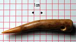 Kleinerer Marlspieker (mit Öhr zum Öffnen von Schraubschäkeln), um den ein Marlspiekerschlag geknüpft ist.