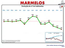 Marmelos war Sitz einer gleichnamigen Gemeinde (Freguesia) im Kreis (Concelho) von Mirandela im Distrikt Bragança. Die Gemeinde hatte 145 Einwohner und eine Fläche von 22,53 km² (Stand 30. Juni 2011)[4].