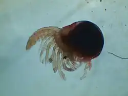 Aus den Ovarien entwickeln sich reifende Eier, aus welchen je nach Wassertemperatur und -qualität (Sauerstoffgehalt) nach drei bis sechs Wochen rund 120 Jungtiere schlüpfen (Rekordwert: 724[4]), und dies im Aquarium ganzjährig alle acht Wochen.[9] Die Eier werden nach der Ablage an den Pleopoden auf der Hinterleibs-(Pleon-)unterseite der Muttertiere befestigt. Die Weibchen nehmen in dieser Zeit keine Nahrung zu sich und suchen Verstecke auf. Die geschlüpften Jungtiere haben eine Körperlänge von etwa 4 mm. Die ersten beiden Jugendstadien nehmen keine Nahrung zu sich und verbleiben auf dem Muttertier. Nach dem Schlüpfen häuten sich die Jungtiere regelmäßig, bis sie im Alter von ca. vier Monaten nach ca. 15 Häutungen selbst die Geschlechtsreife erlangen. Die normale Generationsdauer ist etwa sechs Monate. Ein einzelnes Weibchen kann bis zu sieben Mal Eier produzieren, es häutet sich im adulten Stadium noch bis zu zehnmal. Seine normale Lebensdauer beträgt etwa zwei Jahre, der Rekord liegt bei 1610 Tagen.[10]