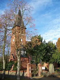 - Die Dorfkirche wurde anstelle eines abgerissenen Vorgängerbaus 1900/1901 nach Plänen des Berliner Architekten Adolf Stegmüller backsteinsichtig auf kreuzförmigem Grundriss im neuromanischen Stil errichtet.[3][4]