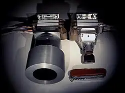 - Das größte und wichtigste Instrument an Bord von Mars Reconnaissance Orbiter ist das HiRISE, das aus einer hochauflösenden Fotokamera mit einem Cassegrain-Teleskop von 1,40 m Länge und einem Durchmesser von 50 cm besteht. HiRISE ist nach HRSC von Mars Express die zweite hochauflösende Stereokamera einer Mars-Sonde. Das Teleskop enthält drei Spiegel und verfügt über ein Sichtfeld von 1,14° × 0,18°. Die Kamera wiegt etwa 65 kg und vermag aus 300 km Höhe Aufnahmen mit einer maximalen vertikalen Auflösung von 20–30 cm pro Pixel zu erzeugen. Für die Aufnahmen stehen drei Spektralbänder zur Verfügung: Blau-Grün BG (400–600 nm), Rot (550–850 nm) und Nah-Infrarot NIR (800–1.000 nm). Im Rot-Band wird ein 6 km breiter Streifen erfasst, in BG und NIR jeweils 1,2 km breit.[5] Die Länge des erfassten Bildes beträgt dabei etwa das Doppelte seiner Breite. Zur Erfassung des einfallenden Lichtes enthält HiRISE insgesamt 14 detector-chip-assemblies (DCA), die jeweils ein CCD-Modul mit der dazugehörenden Steuerelektronik beherbergen. Jedes CCD-Modul besteht dabei aus jeweils 2.048 12 × 12 µm großen Pixeln quer zur Flugrichtung sowie 128 TDI-Elementen entlang der Flugrichtung. Die TDI-Elemente (Time Delay and Integration) werden zur Verbesserung des Signal-Stör-Verhältnisses verwendet. Für das BG- und NIR-Band stehen jeweils zwei DCAs mit insgesamt 4.048 Pixel für jedes Band zur Verfügung. Für das Rot-Band sind es zehn DCAs mit insgesamt 20.264 Pixeln. Zur Echtzeitdatenkompression kann eine Lookup-Tabelle verwendet werden, die mit der Kamera aufgenommene 14-Bit-Signale in 8-Bit-Signale transformiert. Zusätzlich steht eine verlustfreie 2:1-Kompressionsmethode zur Verfügung. Ein typisches hochauflösendes Bild der HiRISE-Kamera ist 20.000 × 40.000 Pixel groß (d. h. ca. 800 Megapixel), und zur Übertragung zur Erde werden in Abhängigkeit von der Erde-Mars-Entfernung und des Kompressionsfaktors 4 bis 48 Stunden benötigt. Die Kamera verfügt über einen internen 28-GBit-Speicher, um die Aufnahmen zwischenzuspeichern, bevor sie an den Bordcomputer weitergegeben werden. Die Entwicklungskosten für HiRISE lagen bei etwa 35 Millionen Dollar. Das Instrument wurde von Ball Aerospace im Auftrag der University of Arizona gebaut.[6][5]