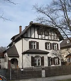 Das Wohnhaus im Landhausstil wurde im Büro von August Exter entworfen. Dieser Typus mit Halbwalmdach, erdgeschossigem Erker und Blendfachwerk im Giebel wurde in verschiedenen Varianten vom Büro August Exter in der Villenkolonie Pasing II gebaut.