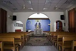 Die alte, aus Ziegeln errichtete Saalkirche von 1985 erscheint nach außen hin im babylonischen Stil wie eine Stufenpyramide (Ziggurat), während das Innere schlicht gehalten ist. In der Apsis im Ostteil befindet sich hinter dem Hochaltar ein großer Fresko der Jungfrau Maria.[1]