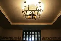 Zwischen Wand und Decke befindet sich umlaufend in damals gern verwendeter Frakturschrift die erste Zeile des Lutherchorals „Ein feste Burg ist unser Gott, ein gute Wehr und Waffen“,[4] ergänzt um den Anfang des Liedes Unsern Ausgang segne Gott von Hartmann Schenck.